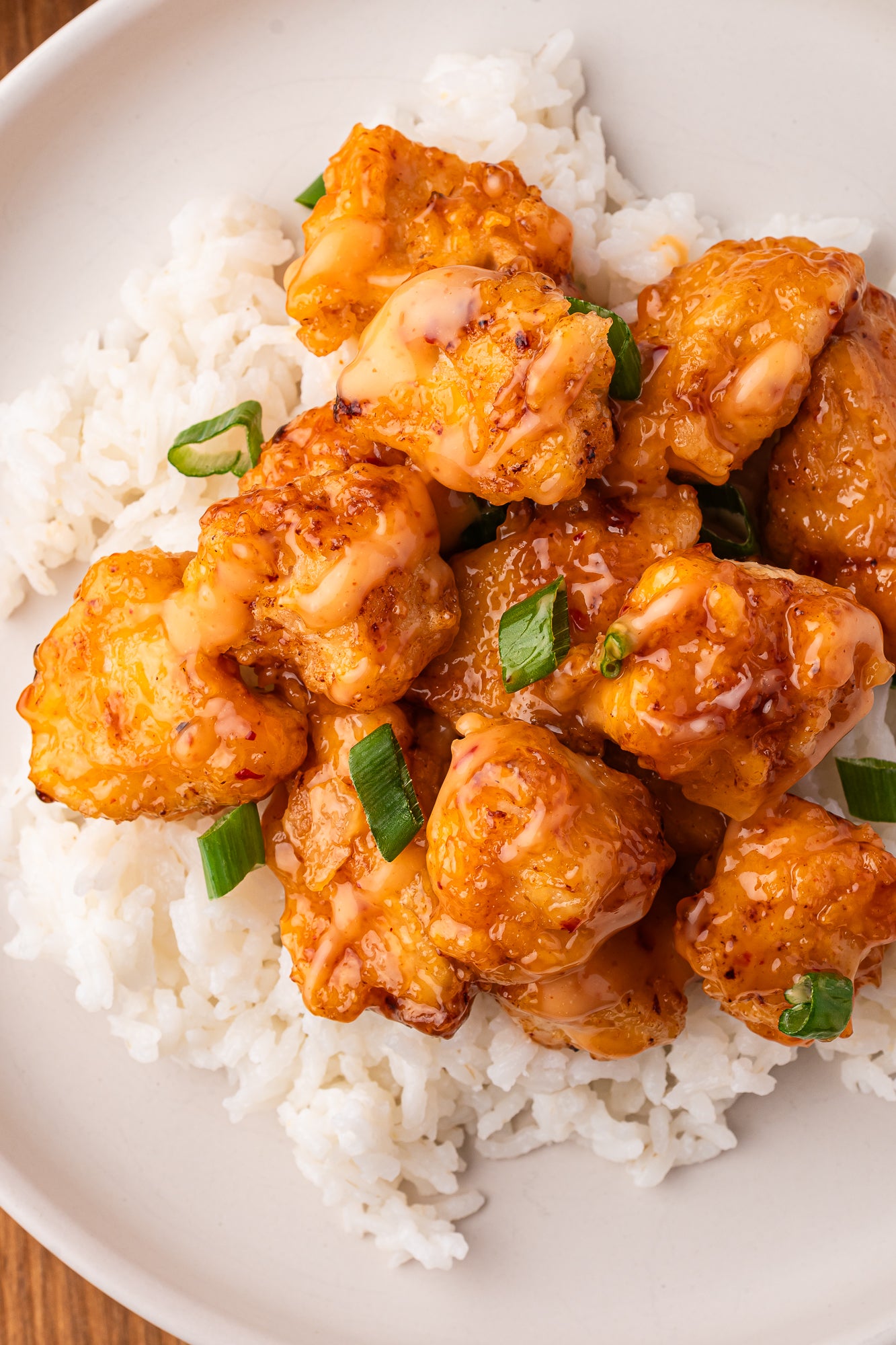 This Bang Bang Chicken is crispy and coated in a creamy sweet-heat sauce. It’s marinated and then fried until perfectly crunchy on the outside while the inside is succulent and juicy. The bang bang sauce is sweet, spicy and creamy. It’s the perfect dinner, served over rice with some fresh green onions.