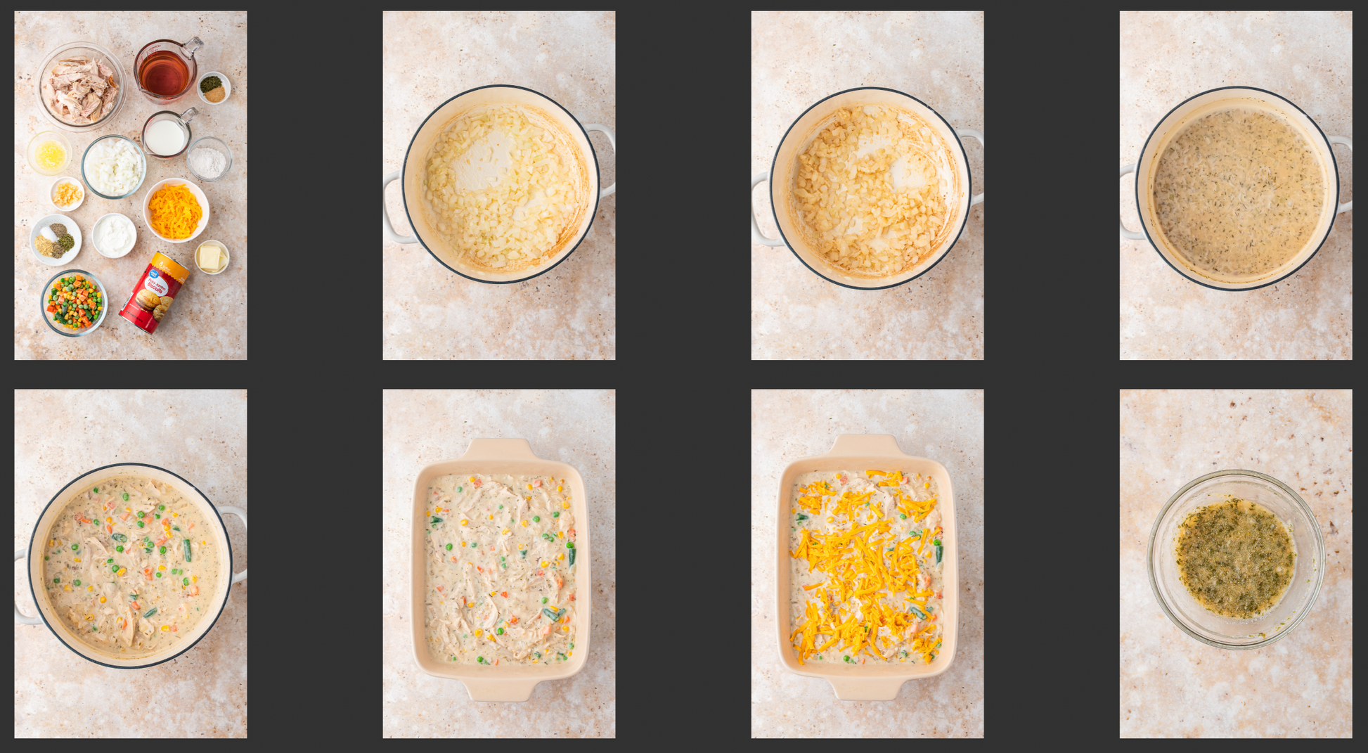 Key Ingredients: rotisserie chicken, can of biscuits, butter, onion, garlic, flour, chicken broth, milk, sour cream, frozen mixed vegetables, dried thyme, dried parsley, cheddar cheese, salt pepper, garlic powder
