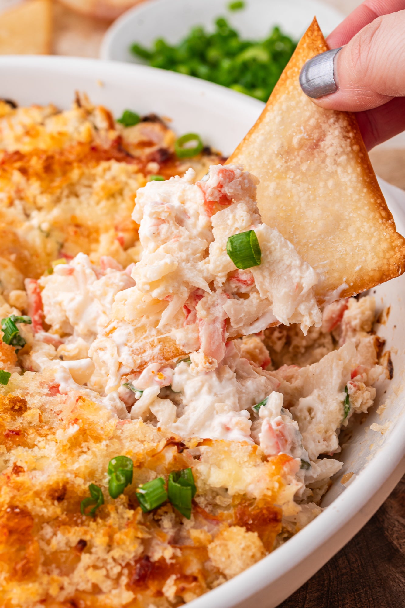 This Crab Rangoon Dip is like a deconstructed crab rangoon and is the perfect appetizer. It combines imitation crab meat, cream cheese and green onions to make the perfect creamy dip.  Topped with a crisp panko layer for a little extra crunch and some sweet chili sauce to complete the take-out flavor. Served with homemade wonton chips, this dip will become an instant classic for parties and gatherings.