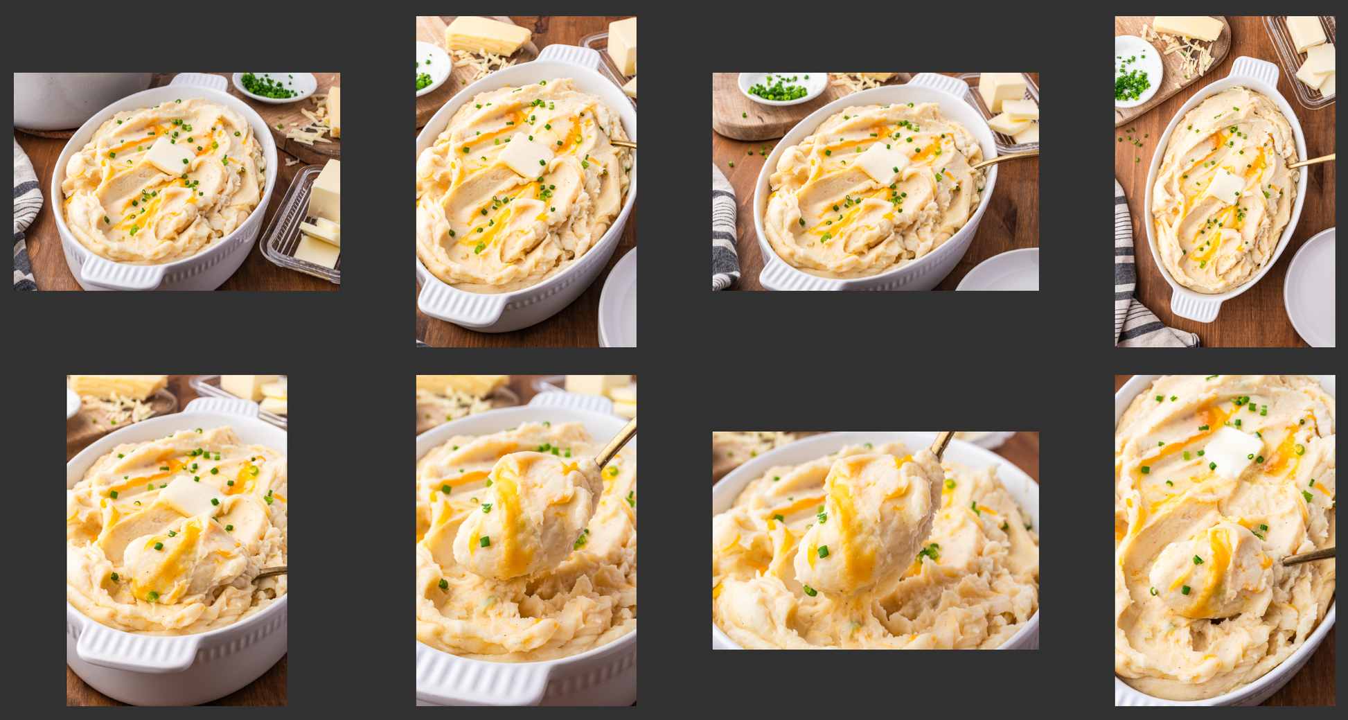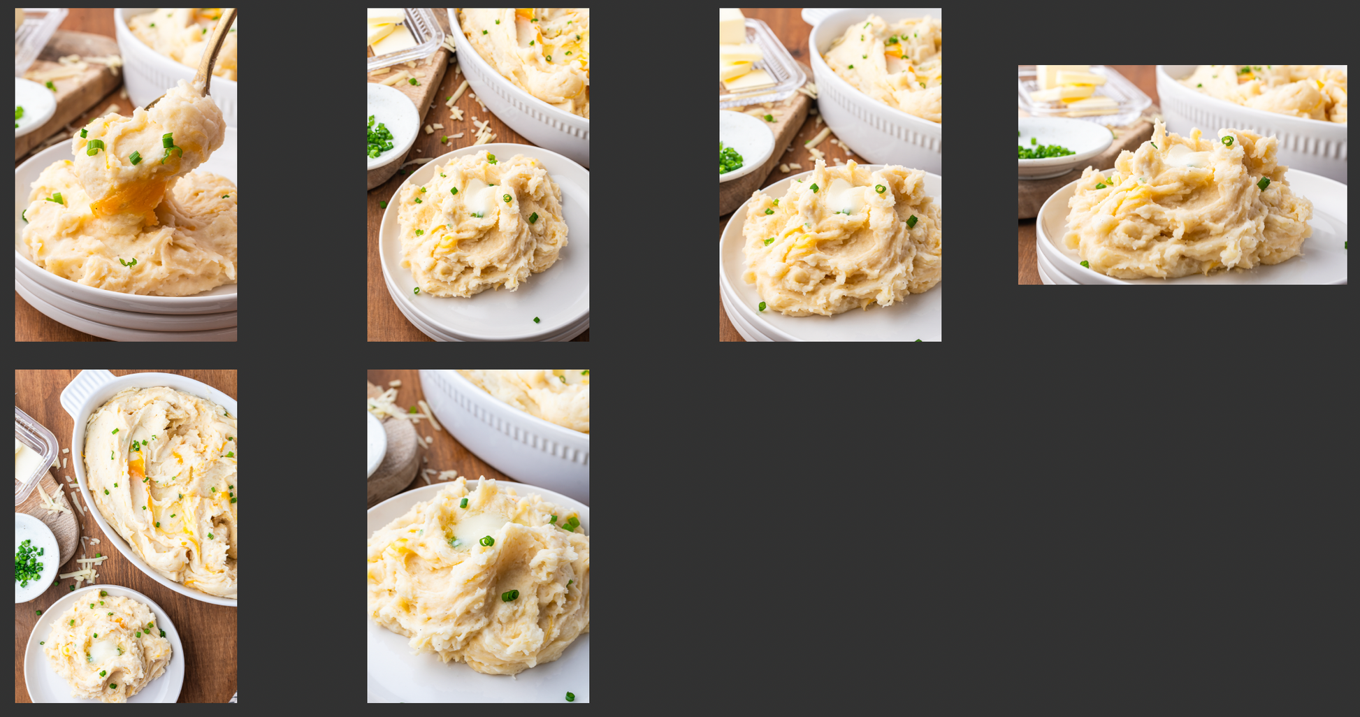 Key Ingredients:  russet potatoes, unsalted butter, heavy cream, sour cream, salt, pepper, garlic powder, Dijon mustard, Gruyere cheese, cheddar cheese, chives