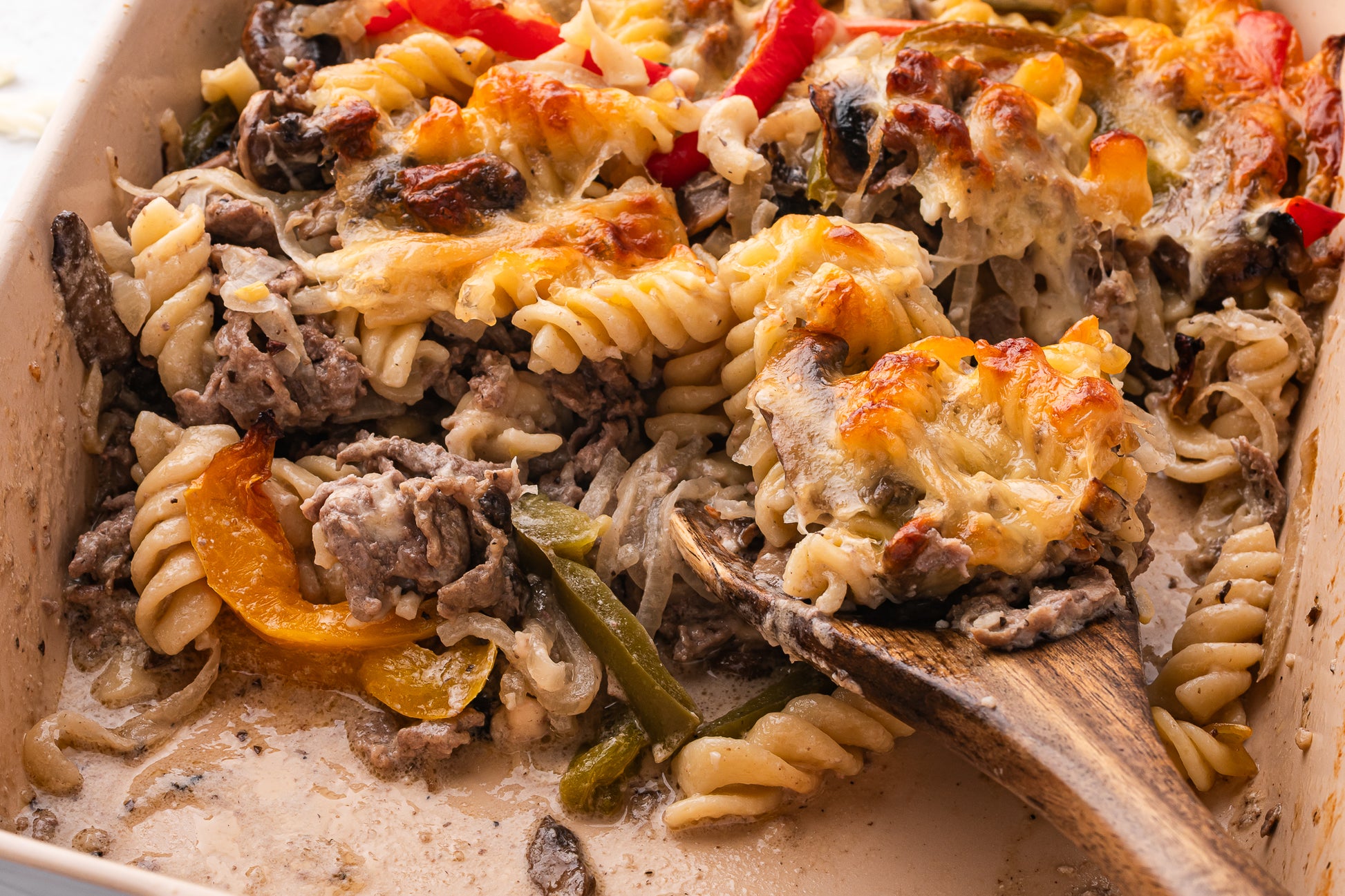 Key Ingredients: shaved steak, onion, bell peppers, olive oil, mushrooms, provolone cheese, mozzarella cheese, sour cream, beef broth, Worcestershire sauce, salt, pepper, garlic, rotini pasta