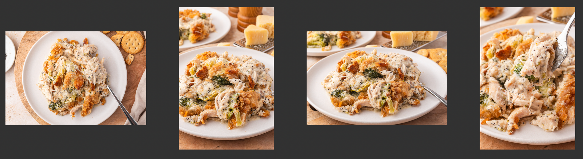 Key Ingredients: rotisserie chicken, frozen broccoli, unsalted butter, Ritz crackers, shallot, all-purpose flour, chicken broth, whole milk, sour cream, Dijon mustard, poppy seeds, garlic powder, salt, pepper, Parmesan cheese