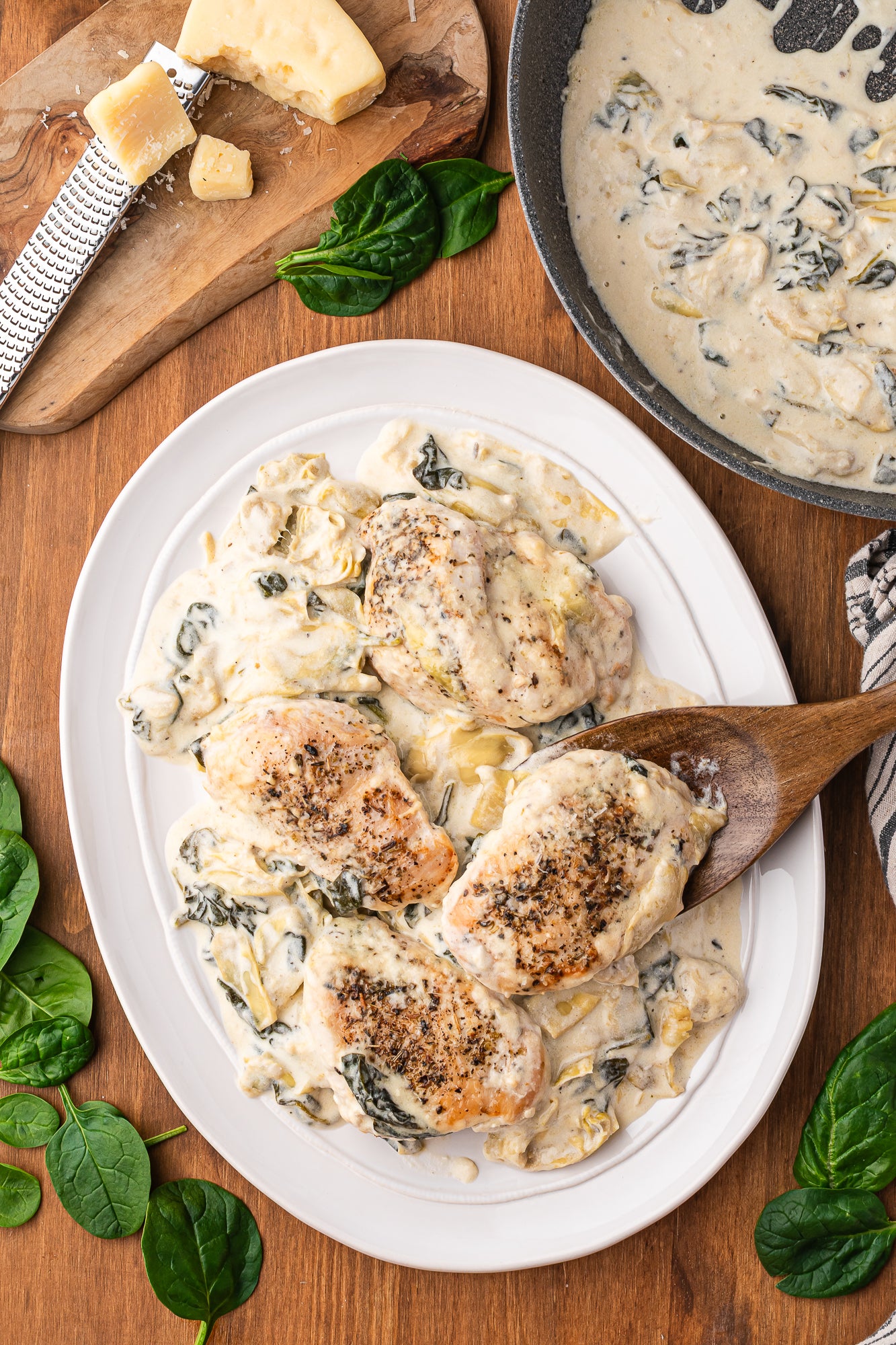 Key Ingredients: chicken breasts, spinach, canned artichokes, sour cream, garlic, Italian seasoning, olive oil, heavy cream, chicken broth, Parmesan cheese, mozzarella, salt, pepper