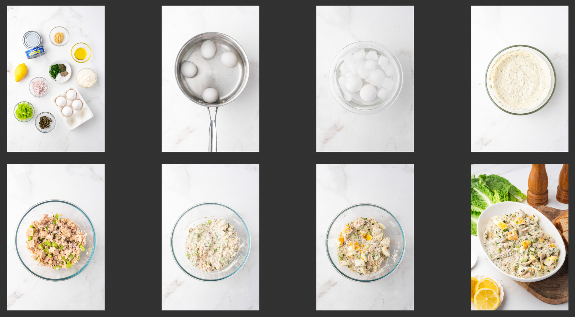 Key Ingredients: canned tuna, eggs, mayonnaise, Dijon mustard, lemon juice, capers, shallot, celery, parsley, dill, salt, pepper, olive oil